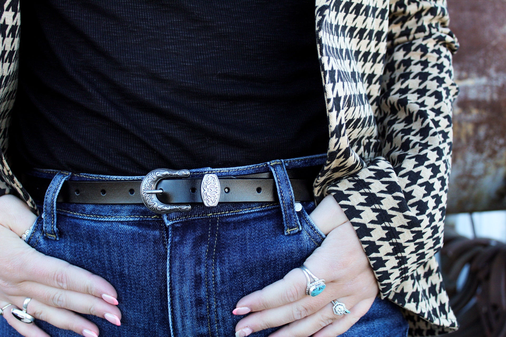 The Anita Belt is your ticket to Western-inspired style that refuses to play it safe. This sleek leather belt pairs effortlessly with everything from flowing bohemian dresses to your go-to denim, delivering that perfect blend of rugged charm and refined elegance. With its slender silhouette and authentic Western detailing, it's the kind of accessory that transforms an outfit from ordinary to unforgettable. Whether you're channeling desert wanderer or modern cowgirl, this belt cinches more than just your waist—it cinches your entire vibe. Make it yours and let it become the piece everyone asks about.