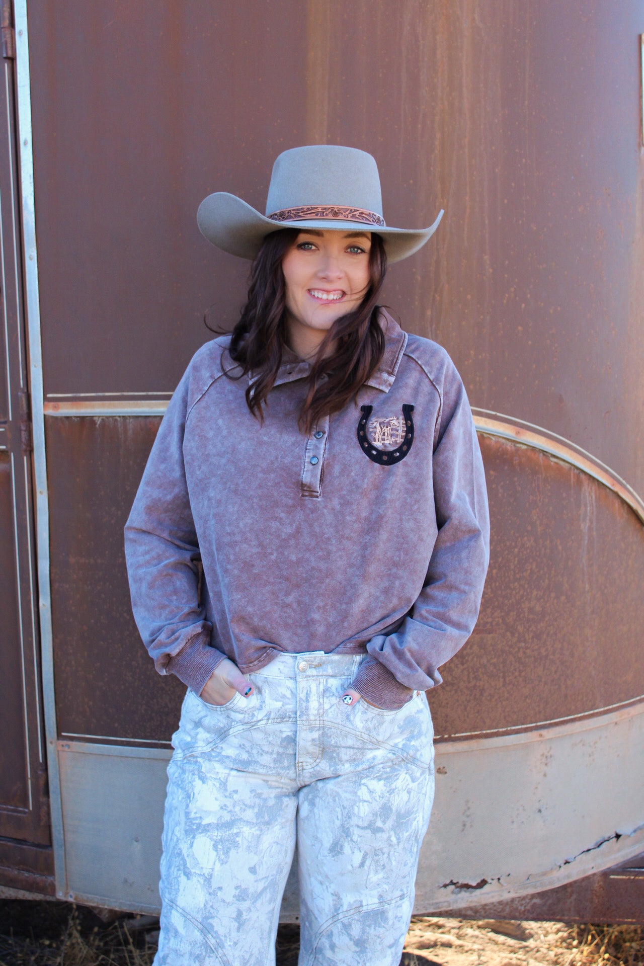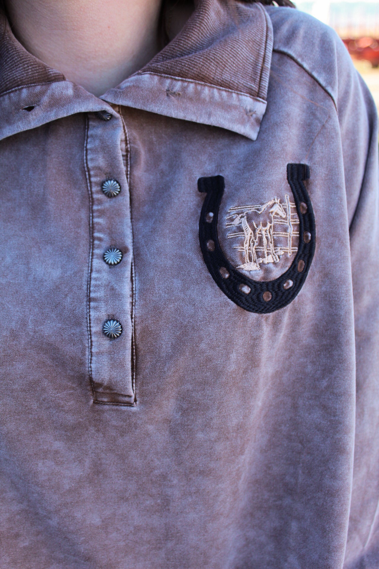 The Rowdy Henley brings Western flair to everyday comfort. This chocolate brown pullover features eye-catching concho buttons down the front and intricate embroidery detailing that adds character without trying too hard. Perfect for those who want to look put-together while keeping things relaxed and casual.