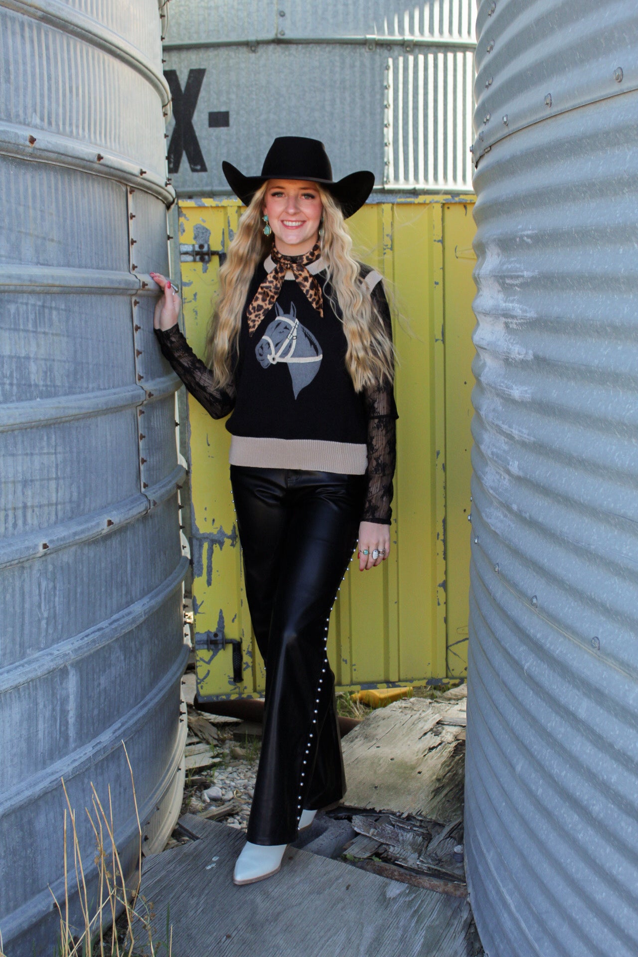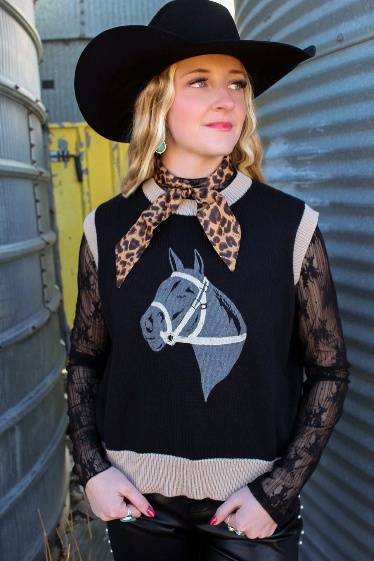 The Zayne Sweater Vest brings vintage charm to your everyday rotation. This cozy black knit features a striking tan trim and a retro horse graphic that channels classic Western vibes. Layer it over your favorite tee for instant personality, or wear it solo for a bold statement piece. Perfect for anyone who loves a little nostalgia mixed with modern style.