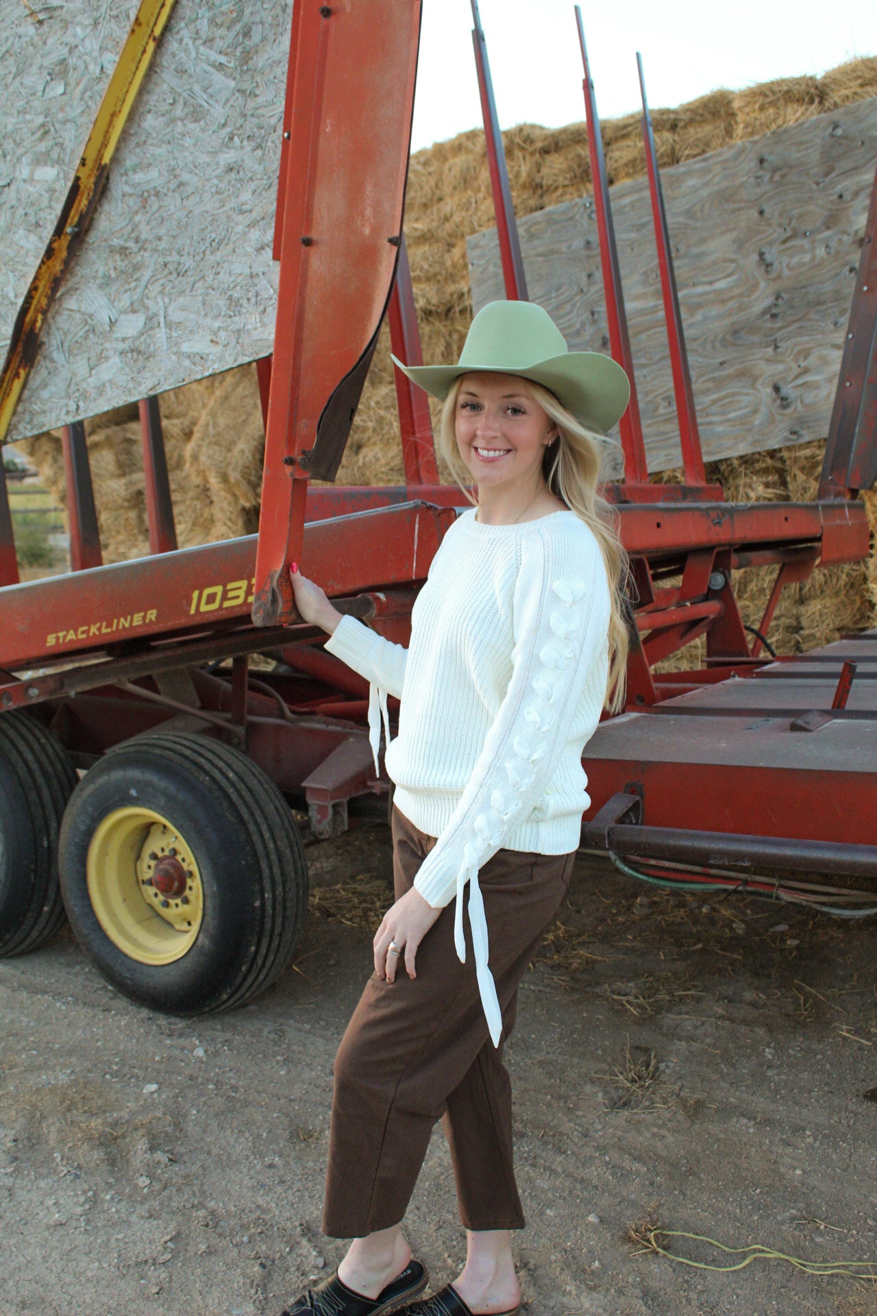 Our Pearl Sweater is the perfect blend of elegance and comfort. Featuring a delicate ribbon sleeve detail, this soft and cozy sweater is the perfect addition to your wardrobe. Whether dressing up or going for a casual look, this sweater adds a touch of class.